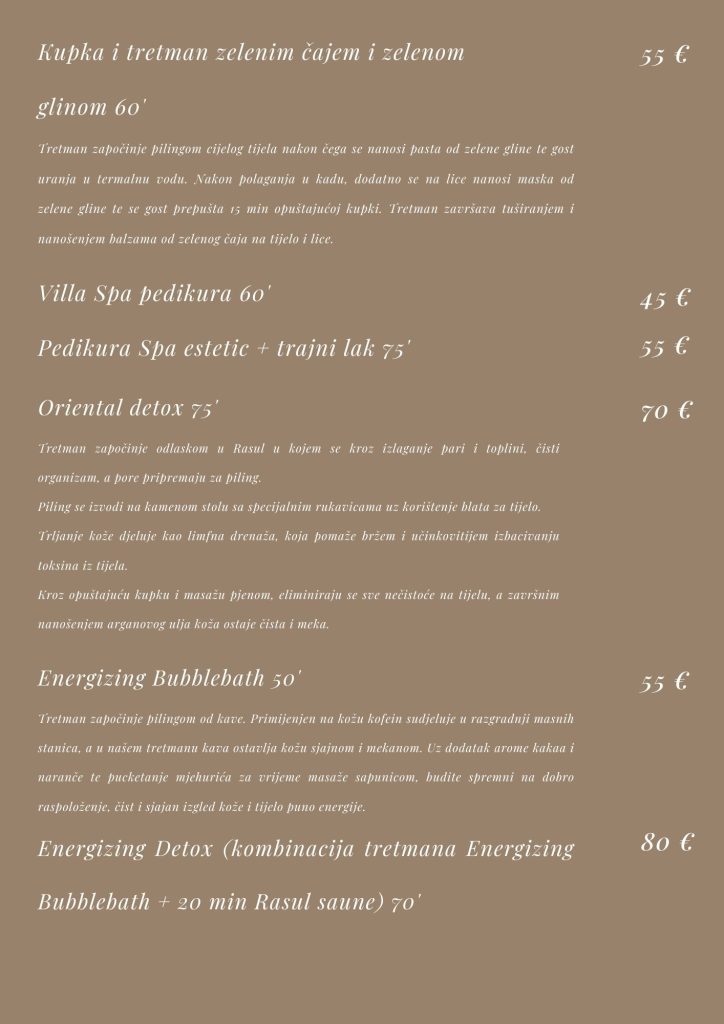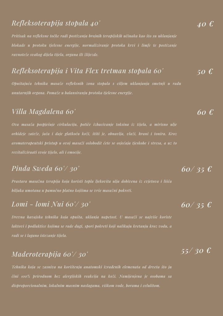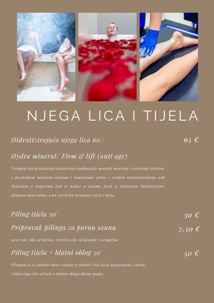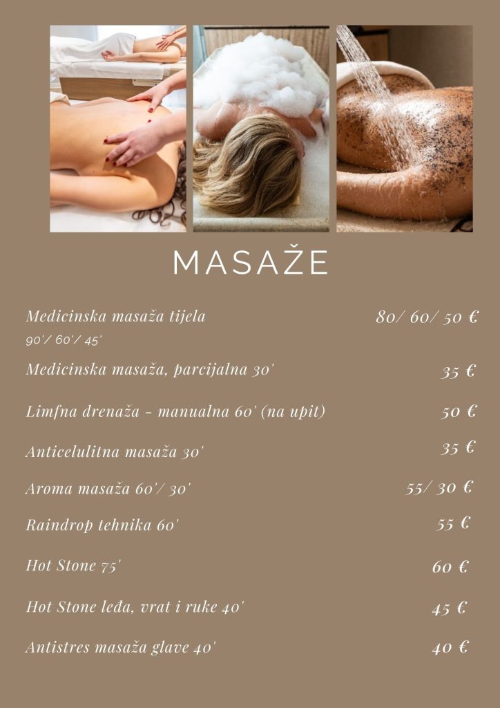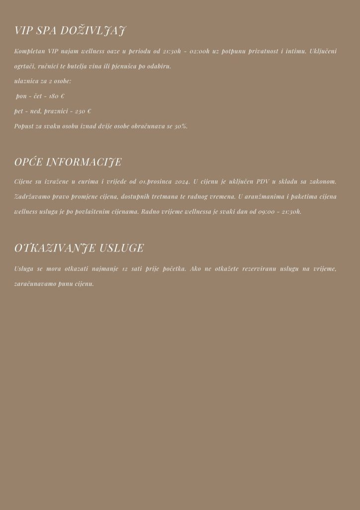 U nastavku možete provjeriti kompletan cjenik naših wellness usluga te kratki pravilnik i općenite informacije o korištenju usluga.