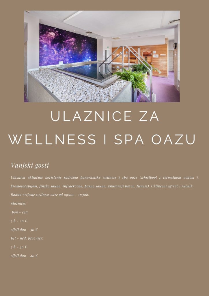 Wellness Spa centar otvoren je od 9:00 do 21:30 . Pridržavamo pravo promjene radnog vremena.